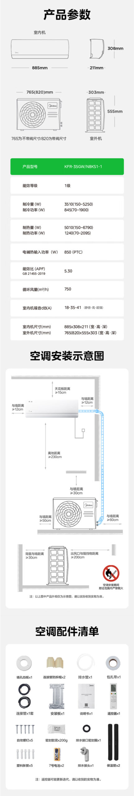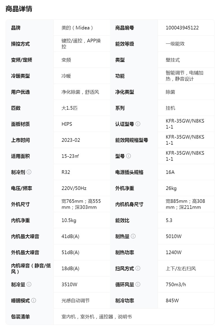美的 KFR-35GW/N8WF1 浅云脂 1.5匹空调