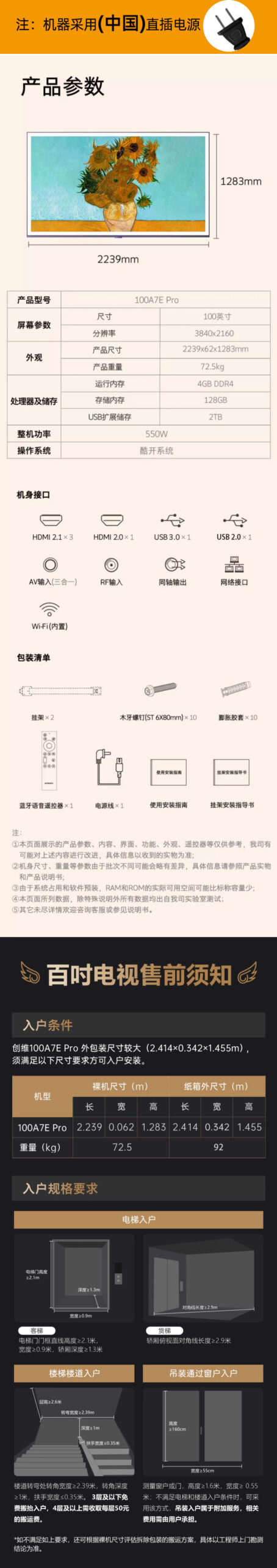 创维壁纸A7E Pro 100寸 智能超薄电视机 数量