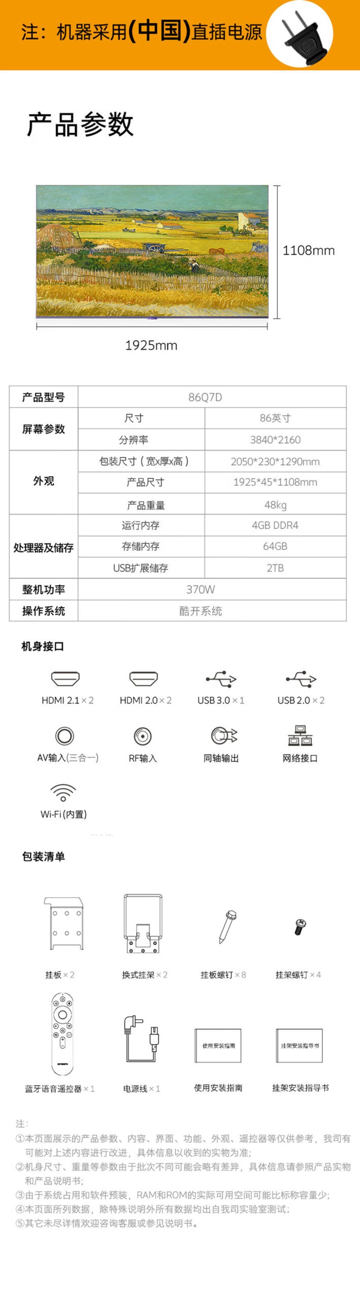 创维壁纸电视86Q7D 86英寸无缝贴墙 哈曼声学 百变艺术屏 240Hz高刷 护眼艺术电视机薄壁挂电视A7E Pro 86英寸