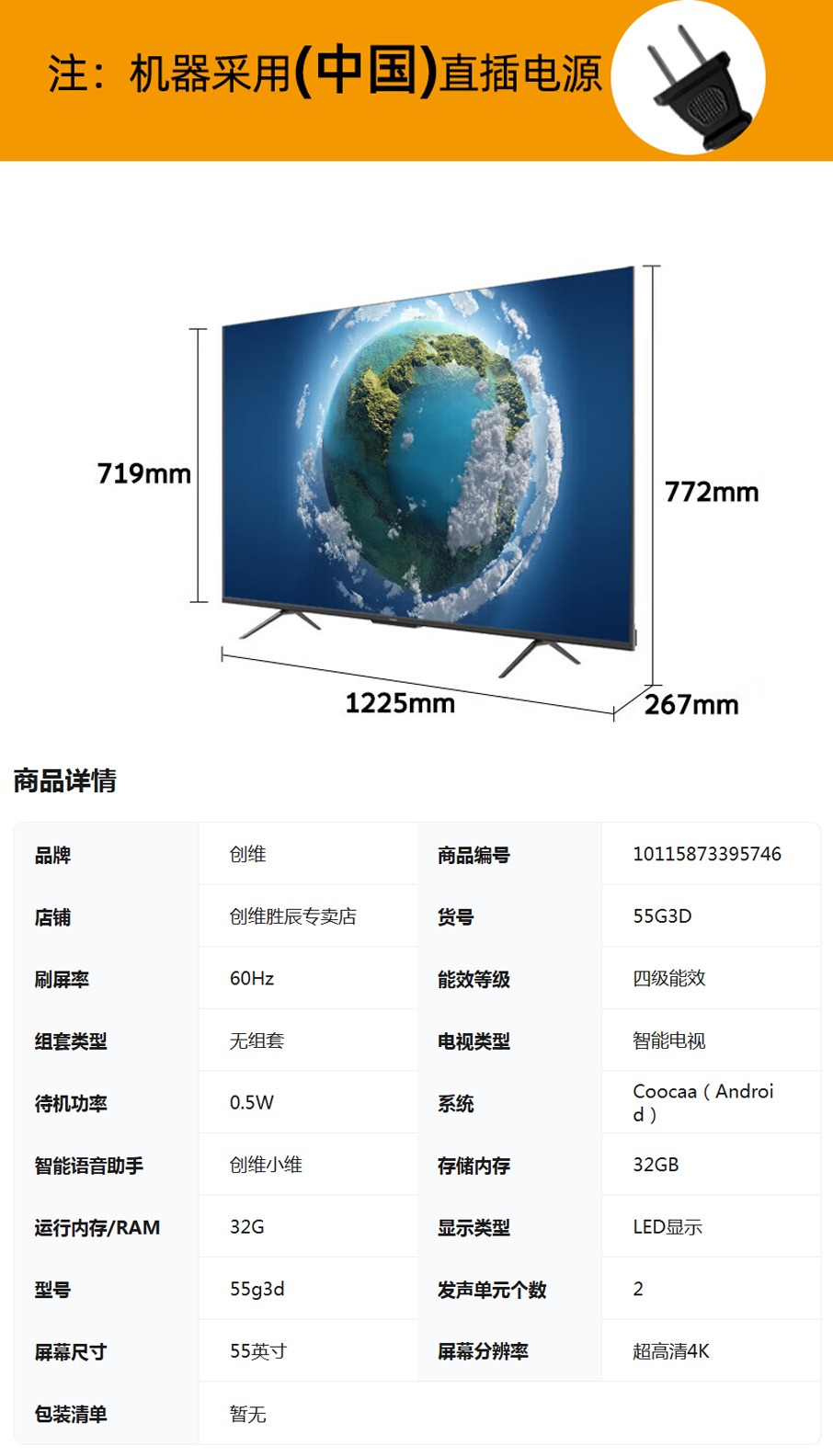 创维(Skyworth)55G3D 4K超高清 护眼防蓝光 节能认证 2+32GB 全时AI语音智能液晶平板电视机 55英寸