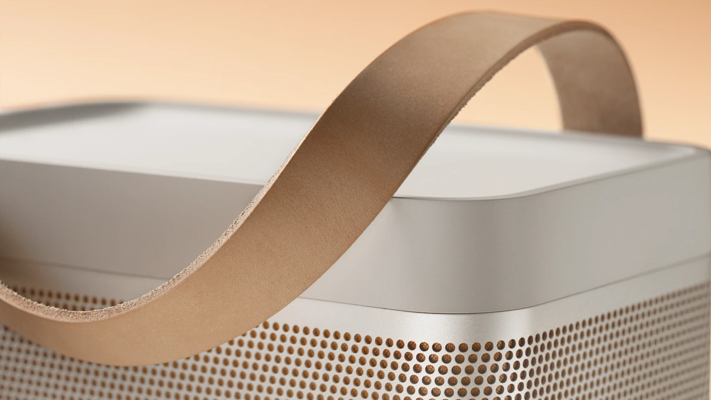将真皮皮带与 Beolit 20 扬声器混合搭配,打造个性化色彩组合。